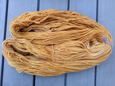 Bei Färbungen mit Naturfarbstoffen kann es immer wieder vorkommen, daß das Garn nicht so gleichmäßig durchgefärbt ist wie bei einer industriellen chemischen Färbung. Dieses Garn wird in liebevoller Handarbeit in kleinen Mengen gefärbt. Geringe Farbunterschiede machen den Reiz dieser Garne aus.