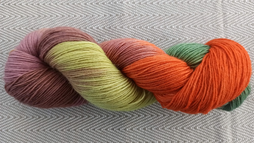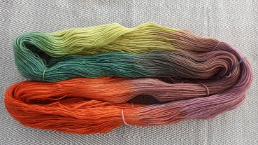 Handgefärbte Sockenwolle mit Farbverlauf in orange-braun-grün