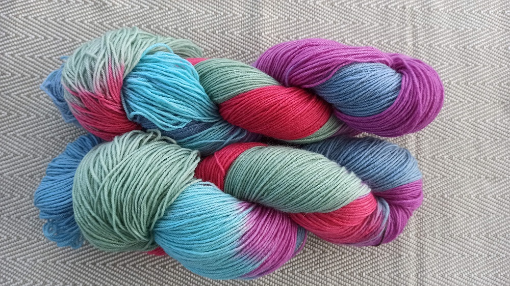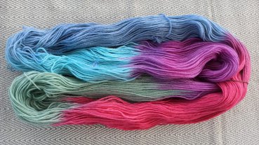 Handgefärbte Sockenwolle mit Farbverlauf in pink-lila-türkis-grün-blau
