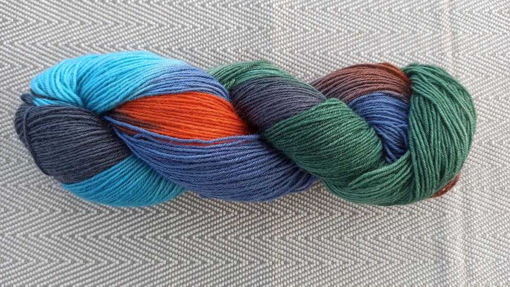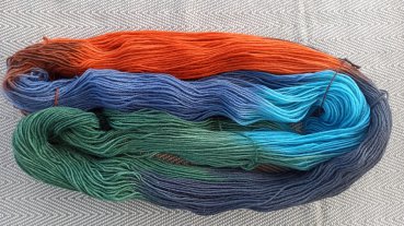 Handgefärbte Sockenwolle mit Farbverlauf in orange-blau-grün-türkis-grau