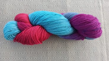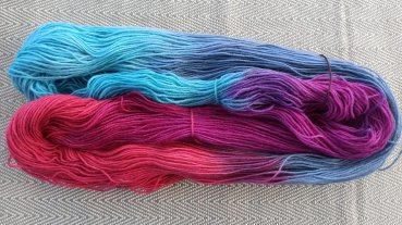 Handgefärbte Sockenwolle mit Farbverlauf in lila-pink-blau-türkis