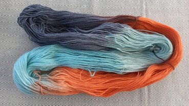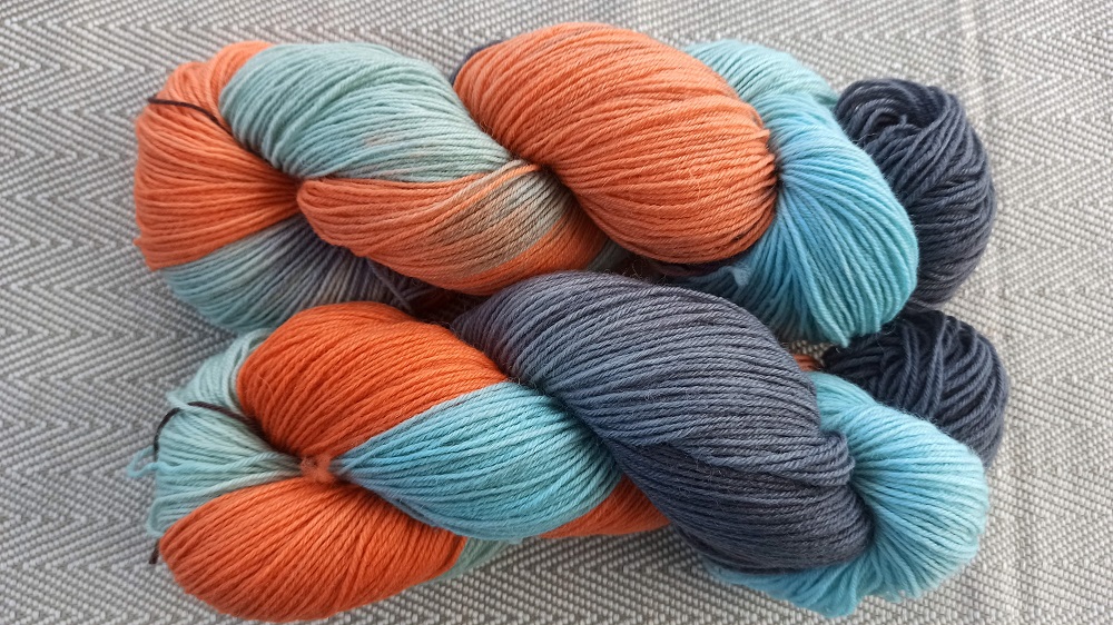 Handgefärbte Sockenwolle mit Farbverlauf in grau-türkis-orange