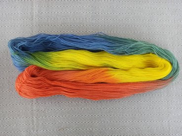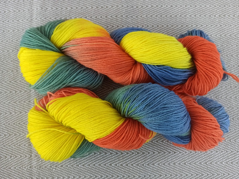 Handgefärbte Sockenwolle mit Farbverlauf in orange-gelb-grün-blau